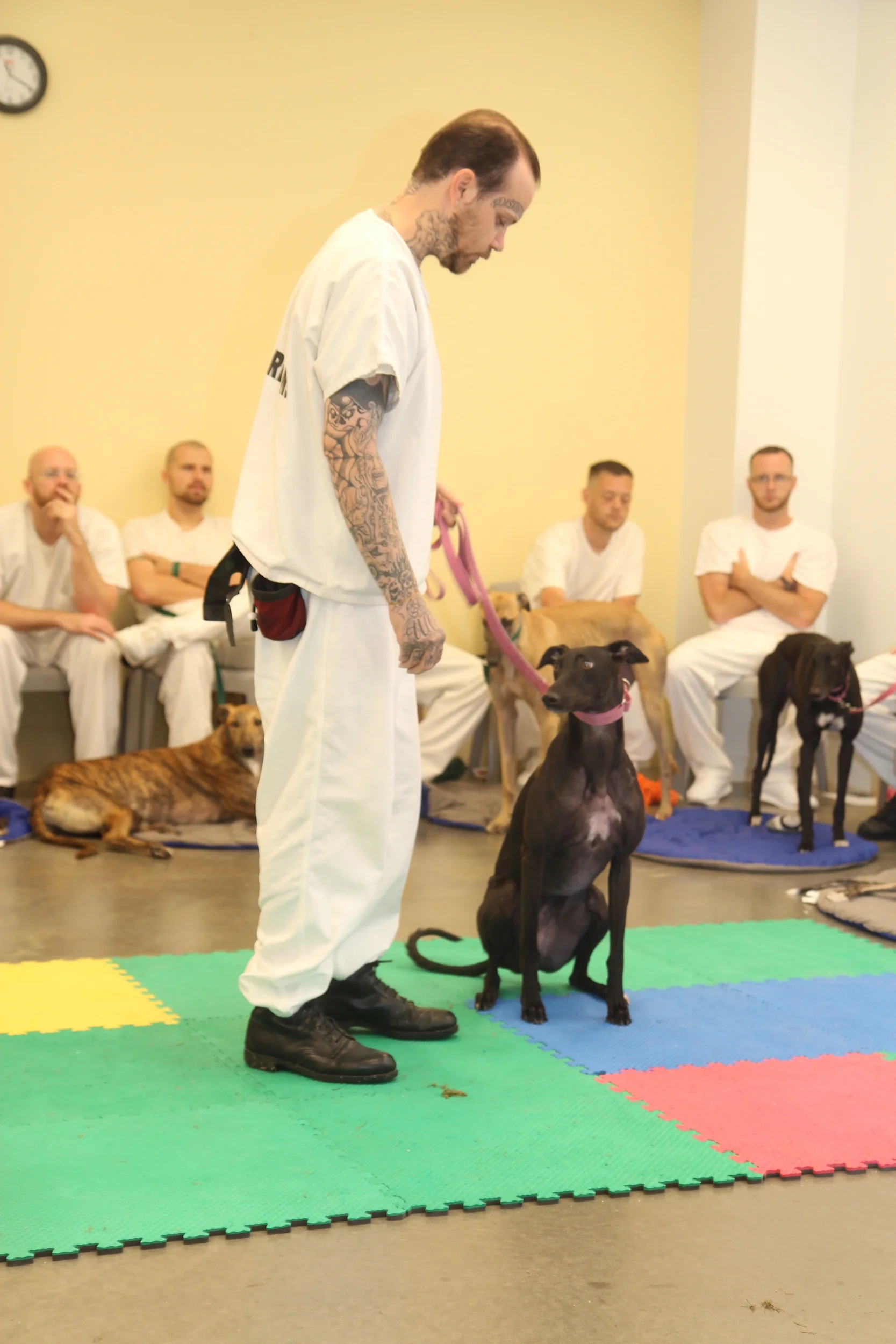 /Although Gracie had her inmate trainer a bit concerned in the beginning because of how timid she was, she has blossomed and slowly came around to be one of the smartest and most obedient Greyhounds in this class. This is largely due to the fact that she had a great support team helping her every step of the way!