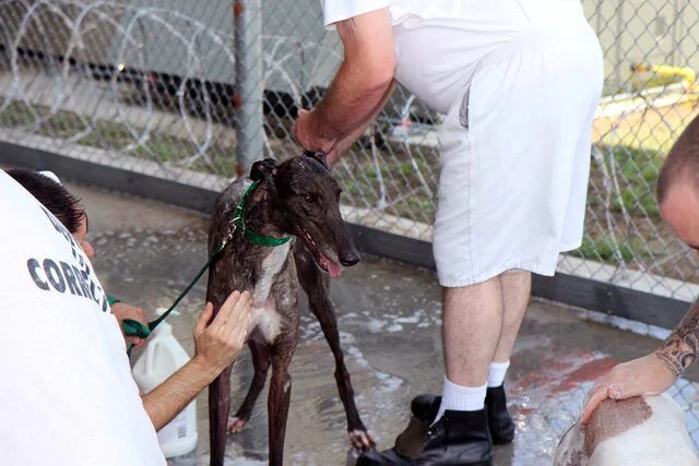 /Hello world! I’m Jarrod, yea the cute one in the photo. So I’m working on adjusting to this new place I’m in. I’m kinda getting the hang of things here and have decided to let my happy side show. My inmate trainer says he likes to see me so happy and full of energy in the mornings! I’ve even started running in the yard! (Something I wasn’t too sure about doing before.) I’m not crazy about all the loud noises around here. My trainer is helping me to adjust, but this place needs to come with a volume control. They got loud doors, rolling carts, noise making radios and lots of people talking. That’s a lot to get used to when you come from the kennels at the track. I’ll get use to it though it’s already getting easier to ignore. I’ve even started laying on the beds in the middle of the loud dorm area without feeling the need to be in my kennel! My inmate trainer says I’m training for retirement. I’m not really sure what a retire-ment is, but it comes with treats so I’m in! He says that all this loud stuff will help me after I graduate and move to my forever home. He says that there I will hear ceiling fans, dish washers, vacuum cleaners, and washing machines. Not sure what these things are either.