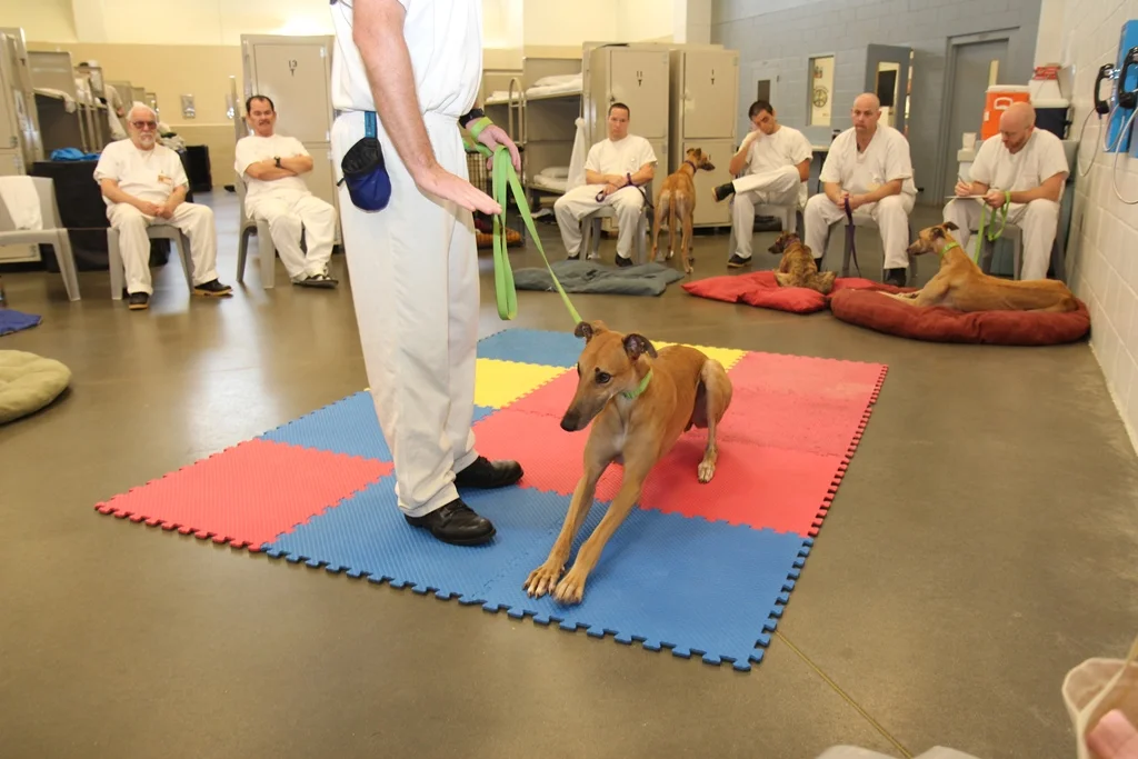 /This is the final week of training with George. His inmate trainer wasn't sure about this tall dog when he first came to the prison, but now he looks over at his buddy George, and says he's his favorite greyhound he's trained so far. With his sweet attitude and big glowing eyes, it's hard not to love him. They didn't see eye to eye on some things, but they always worked through them.