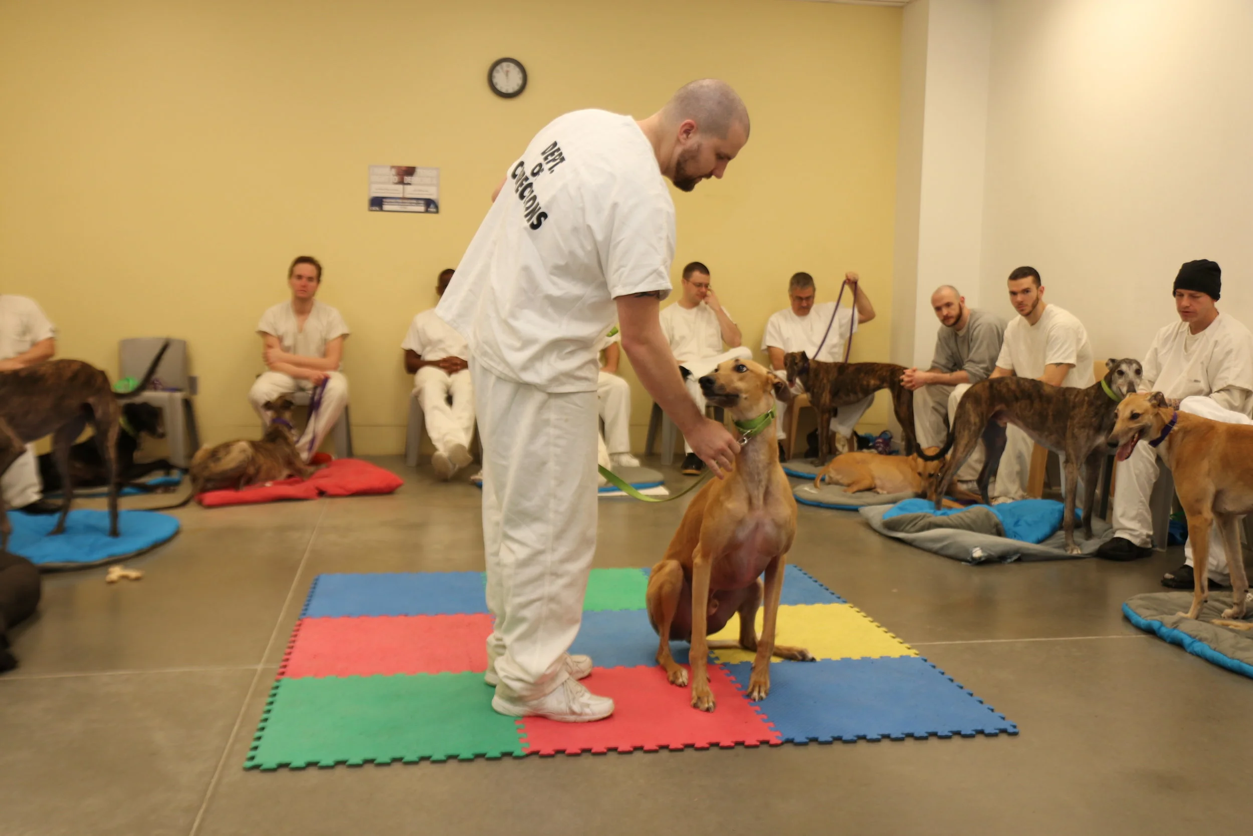 Adonis' inmate trainer reports that this gorgeous greyhound is excelling with his training. It's like everything has just clicked and he is picking up everything very easily. He's done very well with "sit," "heel," "wait," "stay" and even "jump."