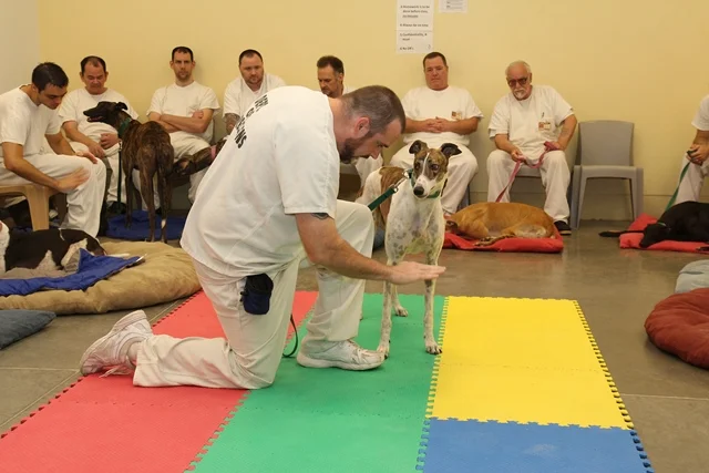 He is also becoming very social with the other dogs. He doesn't show any aggression with them when they are playing with toys or sharing a bed. He is a very mild mannered, good-natured greyhound, and his inmate trainer has grown very fond of Mr. Rocket.